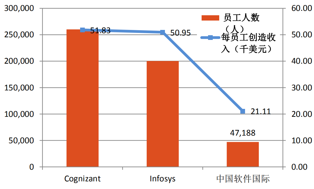 员工数量而言,TCS公司人员数量达到39.5万人,Infosys公司的员工数量达20.4万人,Wipro的人员数量达到16.4万人,而国内******的服务外包企业中软国际公司员工总数刚刚超过6万人,规模相对较小。与印度外包巨头相比,相差一个数量级。